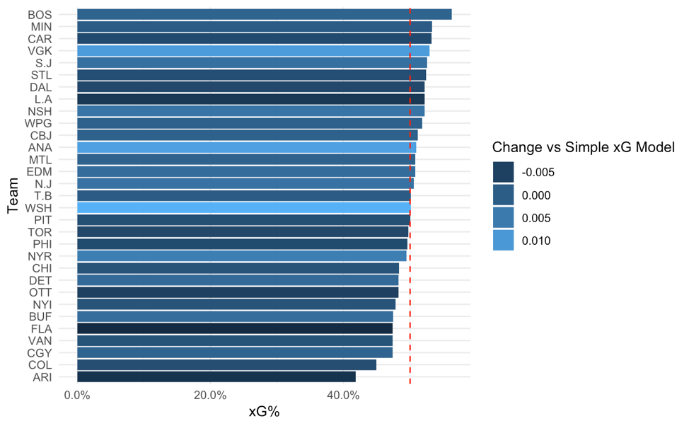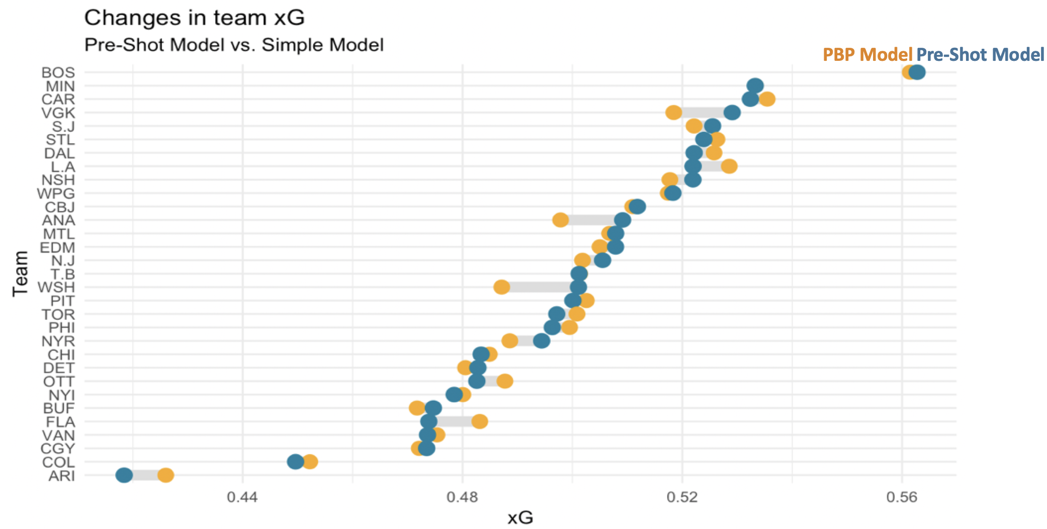 Las Vegas is a particularly interesting case. While the Golden Knights’ performance was surprising to pretty much everyone, the model has them near the top of the league. In addition, Vegas does better in the pre-shot model than the simpler model. This is a positive sign for the model; the difference suggests that it can capture important parts of VGK’s play that standard analysis may have missed. This also helps explain Vegas’ success: they appear to be a particularly strong team when it comes to making their offense more dangerous with passes, and preventing their opponents from doing the same.