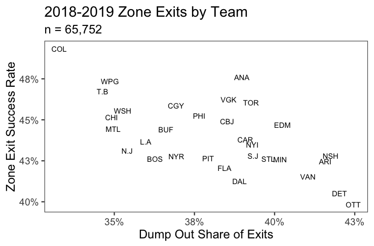 Second, there’s clearly a relationship between dumping out the puck and overall zone exit success. The teams that dump the puck out more often tend to have worse results, and the difference is statistically significant.*