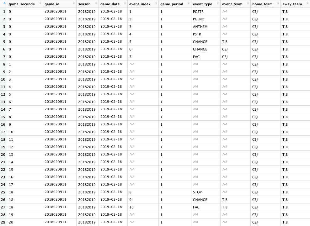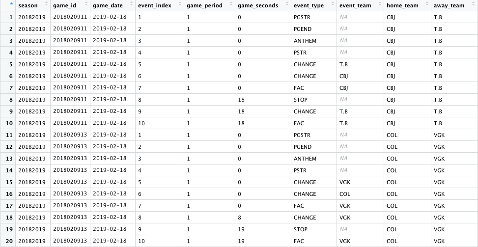 If you’ve ever analyzed hockey data, then you’re probably familiar with the NHL’s Real Time Scoring System, which produces what’s more commonly known as play-by-play data. These data are publicly available and allow us to see every event recorded by the NHL in a given game. Shown below are selected details about the first 10 events from two games on February 18, 2019: Tampa Bay at Columbus and Vegas at Colorado.