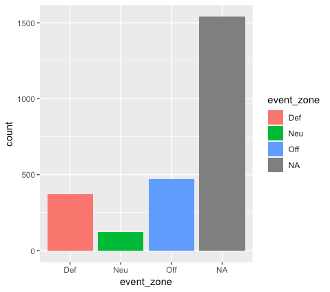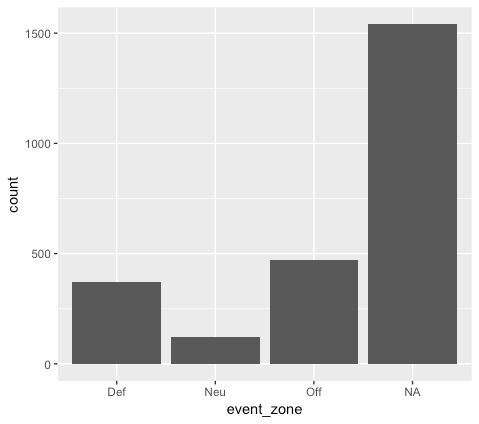 The code above will make a very basic bar chart of how many observations (i.e., events) took place in each event zone. The geom_bar() function indicates which type of chart we’re making, and the “aes” stands for aesthetics. There are many available options here, but here we’re just telling R that we want the event_zone variable on the x-axis. (Note that instead of the pipe %>%, ggplot2 uses a plus sign.)