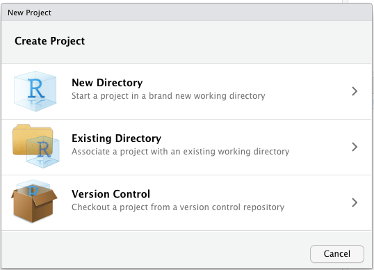 I prefer to do my R work in “projects.” A project generally serves as a folder on your computer where you can keep all of your code and associated files in one place. For example, I have separate projects for my work on goalie pulls and for my work on penalty kills. Create a new project by going to File > New Project.