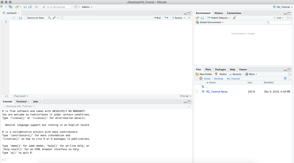 Once you’re working in a new project, we can open a new script file by going to File > New File > R Script. The script, which will move to the upper left, will serve as a convenient place to write and save all of our code. You can also run code line-by-line in the console, but the script makes it easier to write more code and only run pieces at a time.