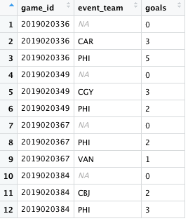 # Let's try that again and remove the NAs first goals_by_game_team <- goal_variable %>% filter(!is.na(event_team)) %>% group_by(game_id, event_team) %>% summarize(goals = sum(goal))
