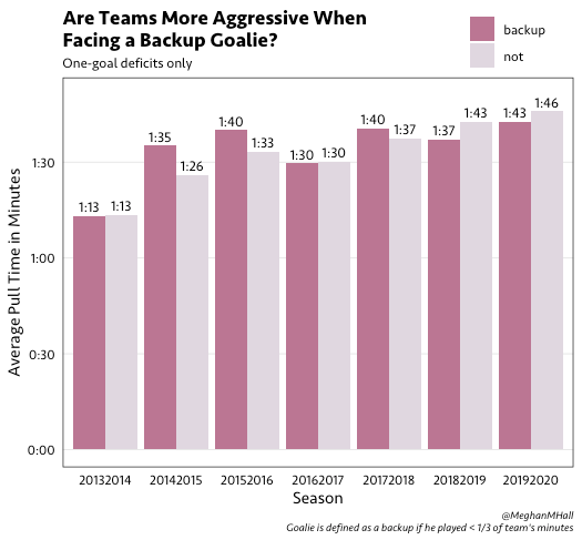 Another logical question involves the opponent: are teams more aggressive in pulling their goalie when they’re facing a backup goalie? A backup goalie was defined as one who played less than one-third of his team’s minutes that year, and as shown below, it appears that there’s not much of a difference.
