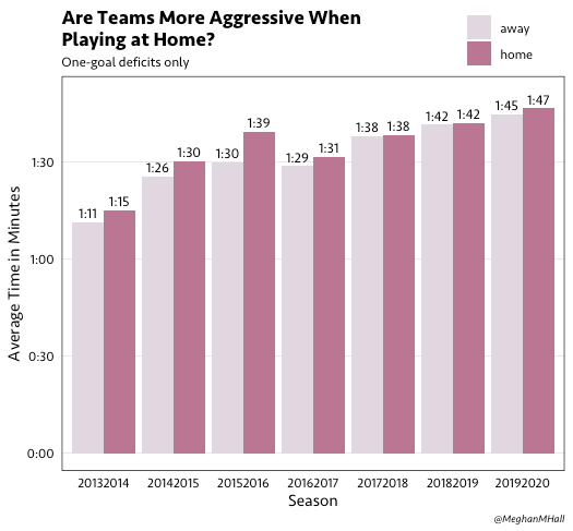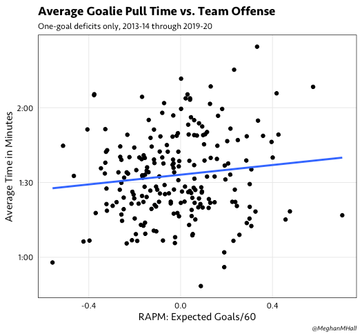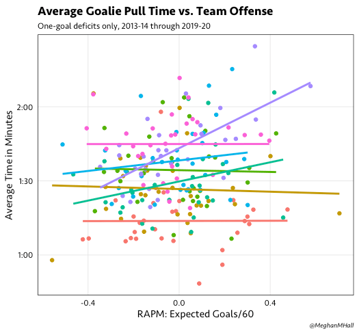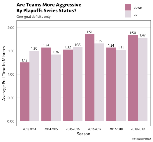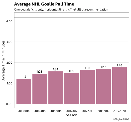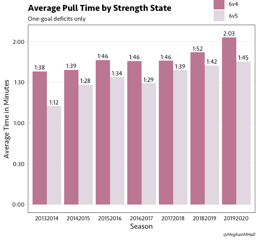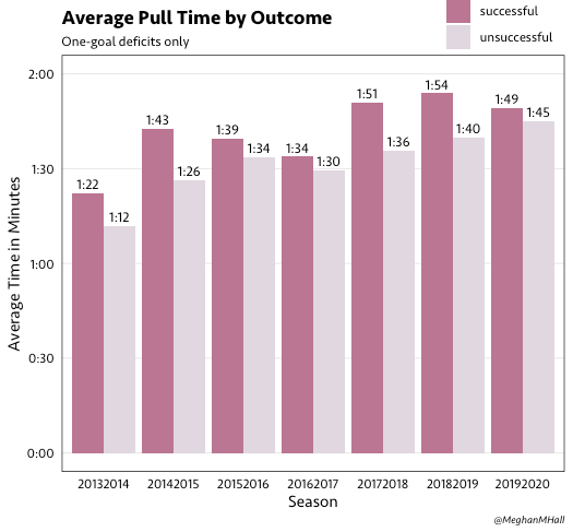 If we only look at games with a one-goal deficit (as those are the games that are most likely to end in a successful outcome for the trailing team), we can see that the average pull time has creeped up about 30 seconds over the past seven seasons.