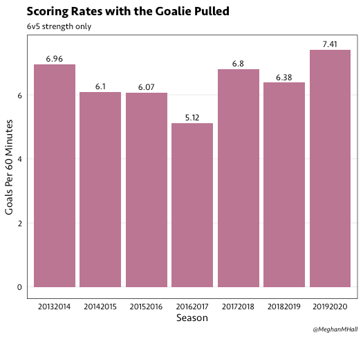When people ask me how to get into sports analytics, I always suggest starting with a question that they’re interested in exploring and using that question as a framework for learning the domain knowledge and the technical skills they need. I feel comfortable giving this advice because it’s exactly how I got into hockey analytics: I was curious about goalie pulling, and I couldn’t find enough data to satisfy my curiosity. There are plenty of articles on when teams should pull their goalies, but aside from a 2015 article on FiveThirtyEight by Michael Lopez and Noah Davis, I couldn’t find much data on when NHL teams were actually pulling their goalies and if game trends were catching up to the mathematical recommendations. I presented some data on the topic at the Seattle Hockey Analytics Conference in March 2019, but the following analysis is broader and includes more seasons of data.