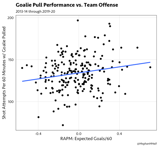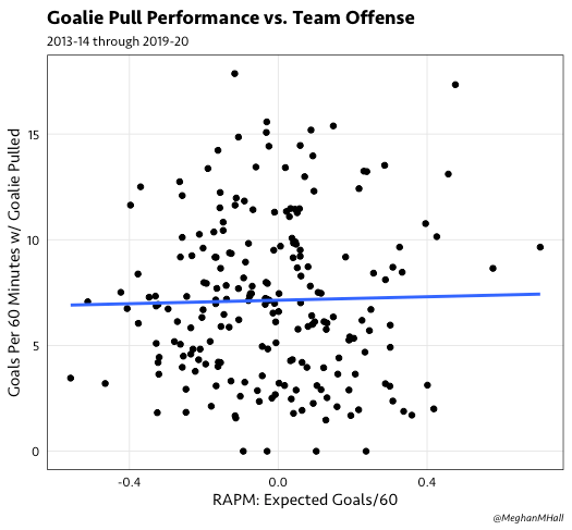As an example, the graph below shows the lack of relationship between team offense (the RAPM metric referenced earlier) and goal scoring rate with the extra attacker.