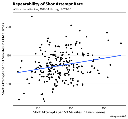 Similarly, the repeatability of scoring goals with the extra attacker (i.e., comparing the goal scoring rate in even games versus odd games for a given team in a given season to examine whether it’s a repeatable skill) is nearly zero. However, as shown below, this correlation between odd games and even games for the shot attempt rate, as opposed to the goal scoring rate, is closer to significant, at 0.22. Replicating this exercise (dividing each team-season into two groups and comparing the rates) 1000 times gives a correlation of 0.19.
