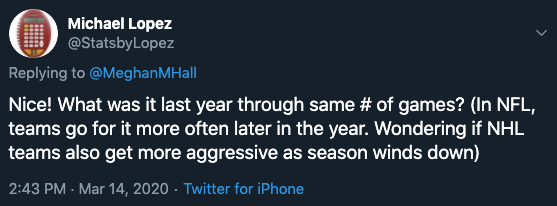 When I posted the last batch of goalie pulling data for the 2019-20 season, Michael Lopez asked the above question about whether there are in-season changes.