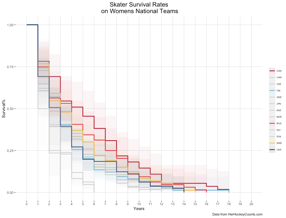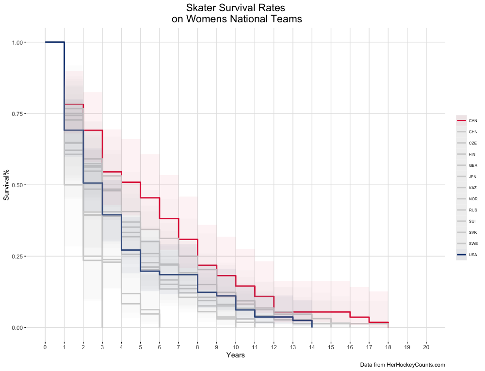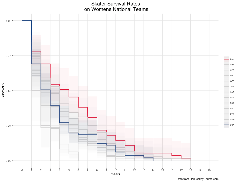 The story on the American side is a little different with players from Sochi that either retired or missed the cut four years later including Alex Carpenter – 6 tournaments (Carpenter did re-enter the national team program in 2019), Anne Schleper – 5 tournaments, Josephine Pucci – 3 tournaments, Julie Chu – 13 tournaments, Kelli Stack – 8 tournaments, Lyndsey Fry – 2 tournaments, Michelle Picard – 6 tournaments. Both Stack and Carpenter were shock exclusions for the 2018 Olympic National team with the former not even getting the call to be part of the centralisation roster despite winning gold with the team at the world championships only a few months prior. This trend can also be seen when we isolate the chart down to just the US and Canada, with Canada clearly having the longer survival curve.