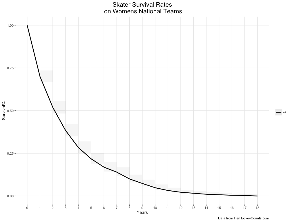 To look into the lifespan of a National Team skater we will be using Survival analysis which is more commonly used in medical and engineering studies and is also known as ‘Time to Event’ analysis. The concept of using it in hockey is loosely based on Namita Nandakumar 2017 work on NHL prospect curves which can be found here, here and here. We will be using this method to be measured in the number of years a player competes internationally for their Country and will take into account gaps for events such as childbirth or injury.