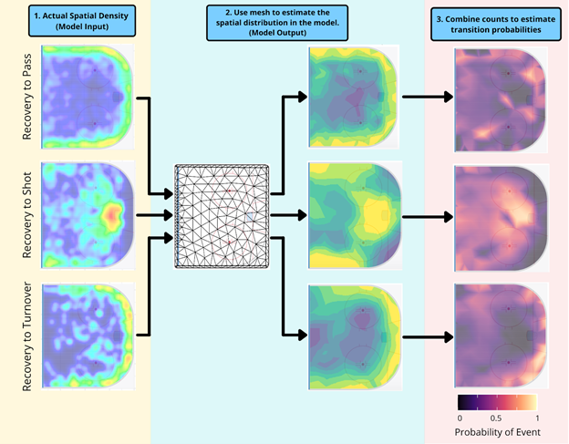 Consider the example of estimating the transition probabilities following a recovery. The Markov decision process flowchart in Figure Y highlights all 3 possible events following a recovery – a shot, a pass, or a turnover. Our model’s main input is where actual observed events occurred following a recovery in the data, represented by the 3 density heat maps in Figure 6.1. Using these 3 sets of data we make 3 different models for the counts or frequency of those transitions actually happening as shown in Figure 6.2. Once we have models for the counts, we follow Cervone et al (2016) by combining the models using the so-called Poisson trick (Lee et al., 2017) to get the probability of transitioning to any of the 3 actions in Figure 6.3.