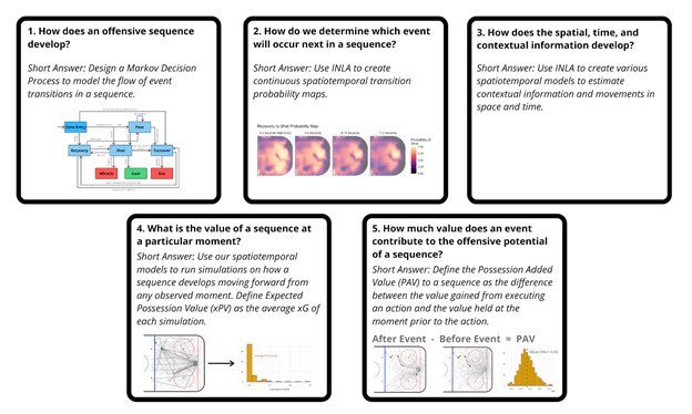 With an overview of what we’re trying to do laid out, we will walk through our five step process in order to determine the offensive value of events through building an ensemble of models that can be used to simulate sequences and estimate the expected value added to the possession by any observed action. Our process will go as follows: