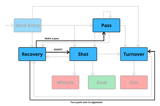 In order to determine how an offensive sequence develops we use a Markov decision process as shown in figure 3. This can be thought of as a flowchart that determines the rules for what actions are possible at different points in the sequence. Each box represents the event that just occurred and the arrows leading out of it represent reasonable transitions to what will occur next.