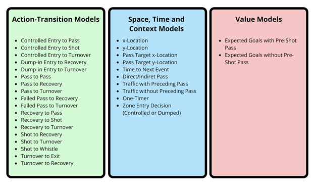 Figure 7 shows all of the models necessary to put the entire time machine together split into three categories. The first of which predict the subsequent action probabilities as previously described in Methods Section 2. The second group predicts where in space and time the play will go to next as well as any covariates which change over time such as whether there is traffic in front of the net. And finally, our expected goals models which value the shots being taken. All of these models use INLA and broadly follow the same process described in Section 2.