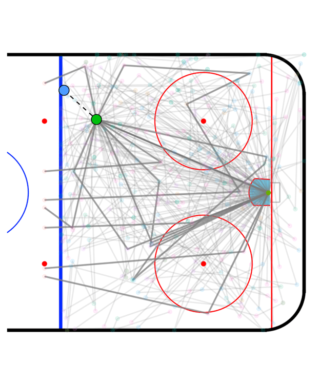 Hockey is a game of making the best possible decision in the shortest amount of time. Players need to react quickly to form a chain of plays to create valuable scoring chances. Our goal is to quantify the value of player actions as a function primarily of space and time in the offensive zone. This is to recognize that the puck location and the threat-level it poses to the opposition is a key driver of what options will be available to the puck carrier and – as a result – what is likely to happen next. Ultimately, we want to credit players that are able to make high quality decisions and difficult plays which advance the puck into more valuable locations on the ice.