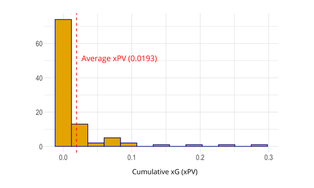 For each simulation run we store the xPV building a distribution for the value at a given point as shown in Figure 9. The distribution of values represents the total model uncertainty of value at that point which we will later use to quantify the uncertainty in our player metrics. For example, in Figure 9 we see that the average xPV of the sequence at the moment shown in Figure 8 (green point above) is 0.0193, however, there are rare cases where we are able to gain up to 0.3 xPV moving forward.